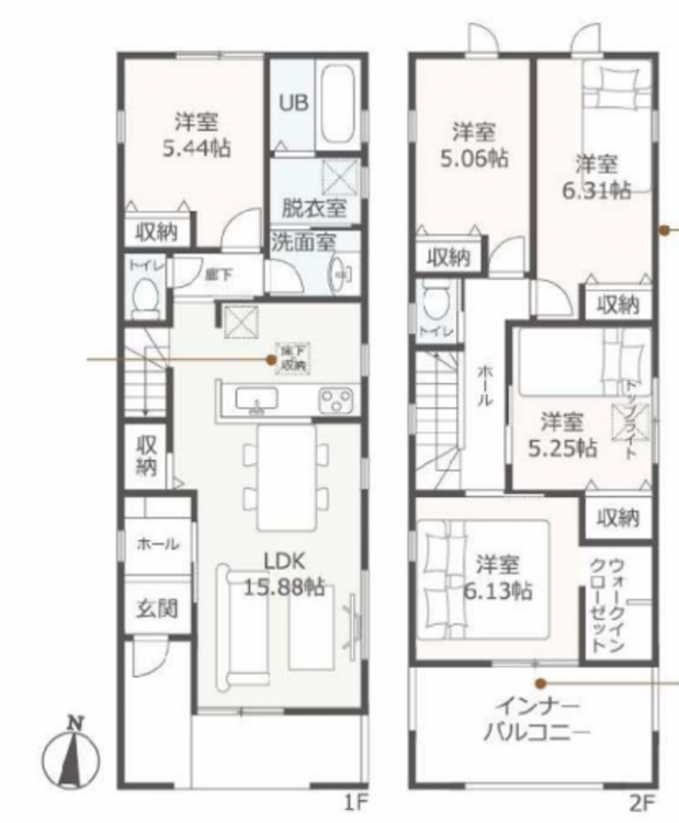 - システムキッチン、浴室乾燥機、モニタ付インターホン、ウォークインクローゼット、複層ガラス、駐車場2台分、床下収納、トイレ2箇所