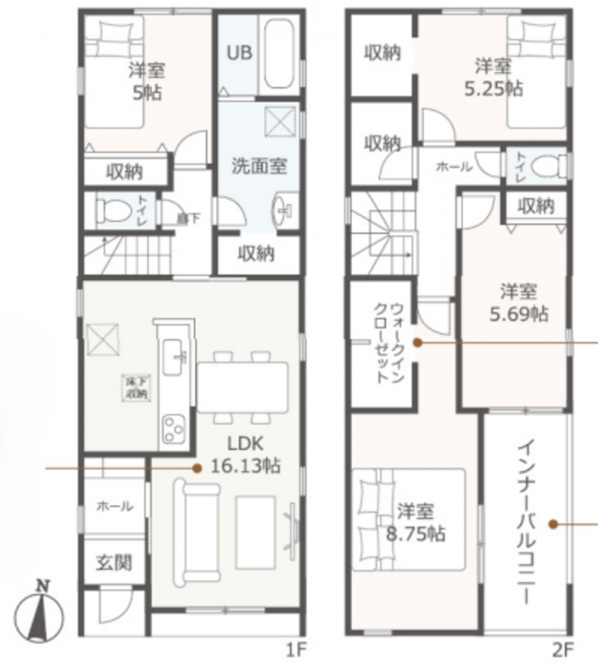 - システムキッチン、浴室乾燥機、モニタ付インターホン、ウォークインクローゼット、複層ガラス、駐車場2台分、床下収納、トイレ2箇所