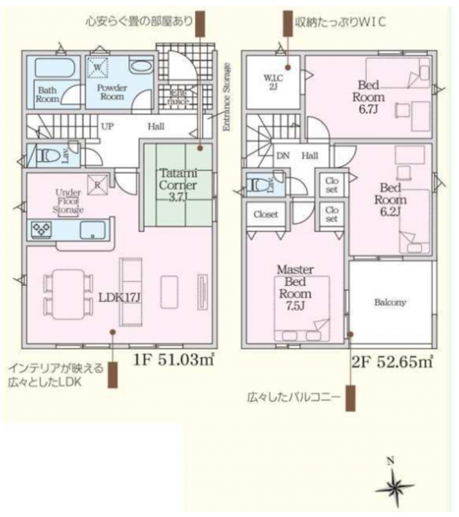 - システムキッチン、カウンターキッチン、シャンプードレッサー、浴室乾燥機、モニタ付インターホン、洗浄便座、ウォークインクローゼット、複層ガラス、床下収納、トイレ2箇所