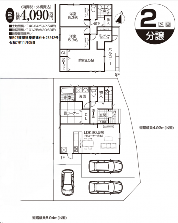 - システムキッチン、モニタ付インターホン、洗浄便座、ウォークインクローゼット、複層ガラス、駐車場3台分、床下収納