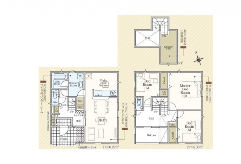 - システムキッチン、カウンターキッチン、シャンプードレッサー、浴室乾燥機、モニタ付インターホン、洗浄便座、グルニエ(屋根裏部屋)、複層ガラス、トイレ2箇所