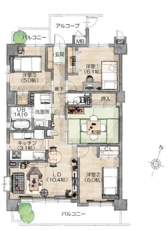 - システムキッチン、浴室乾燥機、モニタ付インターホン、洗浄便座、オートロック、エレベーター